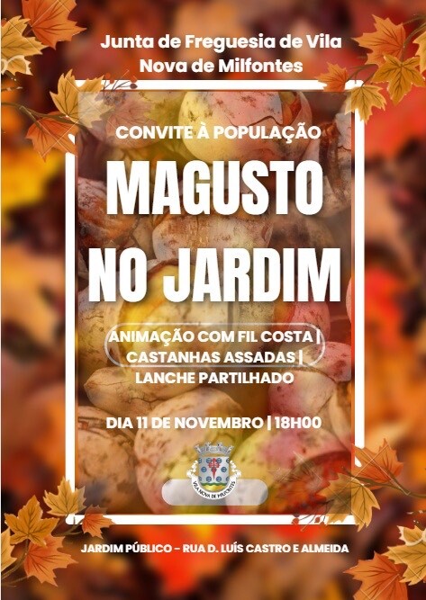 No próximo dia 11 de novembro, Dia de São Martinho, a partir das 18h00, decorre o tradicional Magusto no Jardim Público de Vila Nova de Milfontes com animação de Fil Costa.